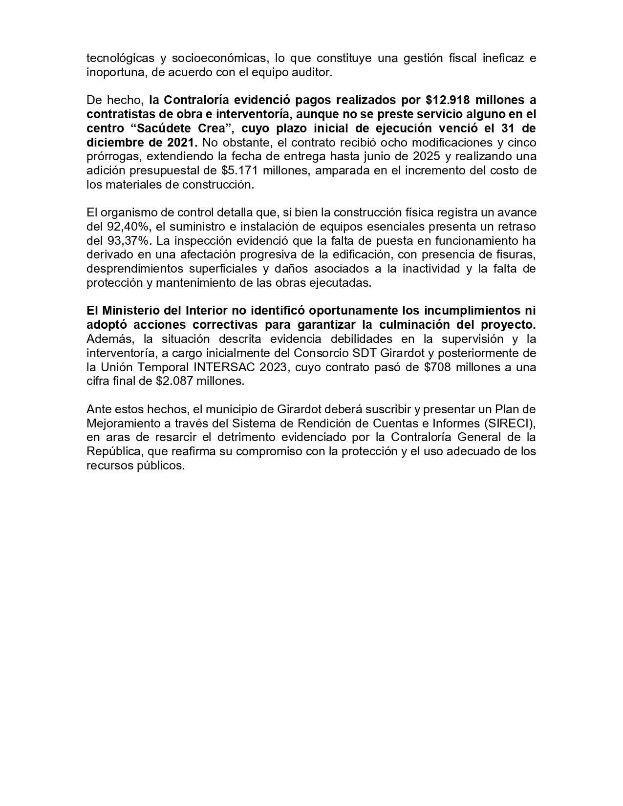De los $17.359 millones destinados al proyecto, se han efectuado pagos por $12.918 millones a contratistas de obra e interventorรญa. El organismo de control califica este monto como daรฑo patrimonial debido a que la infraestructura estรก abandonada y presenta deterioros fรญsicos visibles.